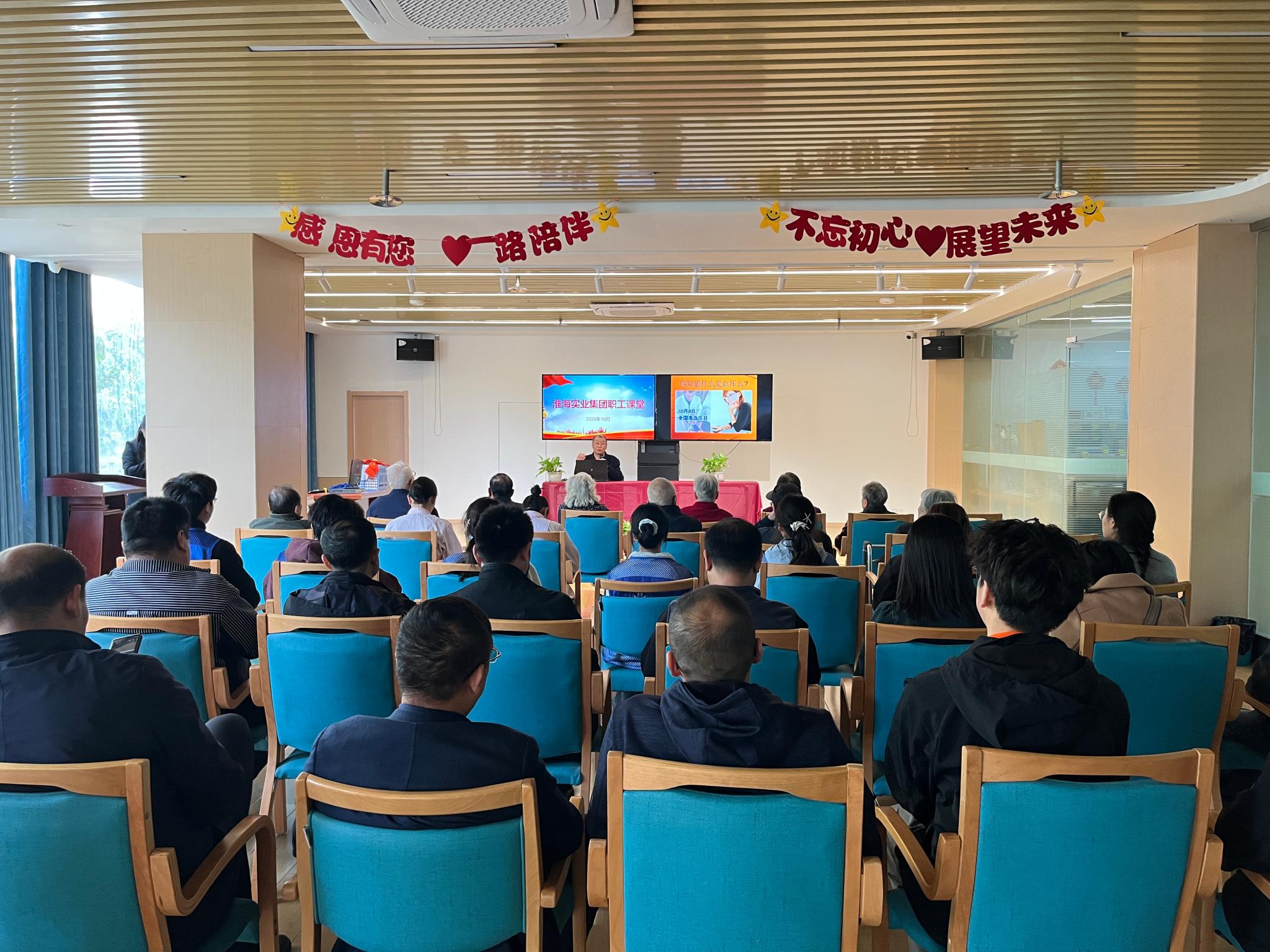 10月22日,淮海實業集團工會在相王現代淮海康養中心舉辦“職工課堂”,特邀淮北市中醫院心病科主任、主任中醫師、副教授花繼平做“高血壓的中西醫防治”專題講座。來自集團公司各單位及康養中心的長者共48人參加。